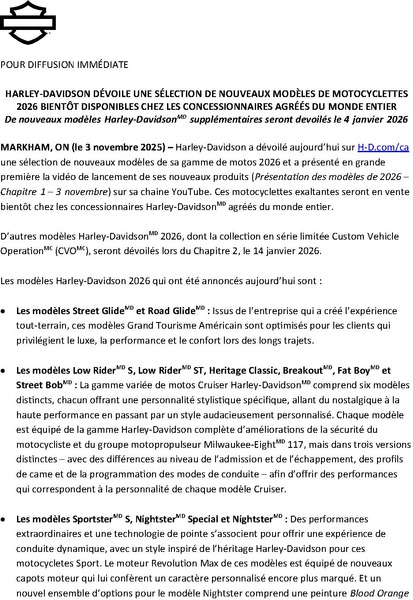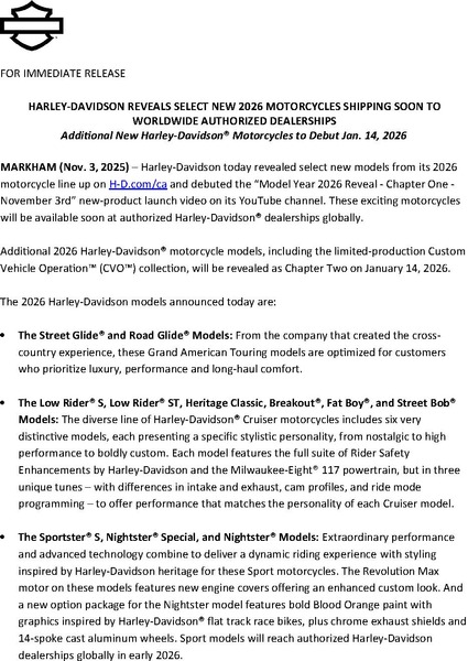 MARKHAM (Nov. 3, 2025) – Harley-Davidson today revealed select new models from its 2026 motorcycle line up on H-D.com/ca and debuted the “Model Year 2026 Reveal - Chapter One - November 3rd” new-product launch video on its YouTube channel. These exciting motorcycles will be available soon at authorized Harley-Davidson® dealerships globally.