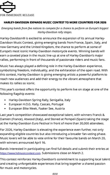 HARLEY-DAVIDSON EXPANDS MUSIC CONTEST TO MORE COUNTRIES FOR 2026
