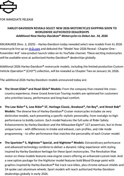 MILWAUKEE (Nov. 3, 2025) – Harley-Davidson today revealed select new models from its 2026 motorcycle line up on H-D.com and debuted the “Model Year 2026 Reveal - Chapter One - November 3rd” new-product launch video on its YouTube channel. These exciting motorcycles will be available soon at authorized Harley-Davidson® dealerships globally.