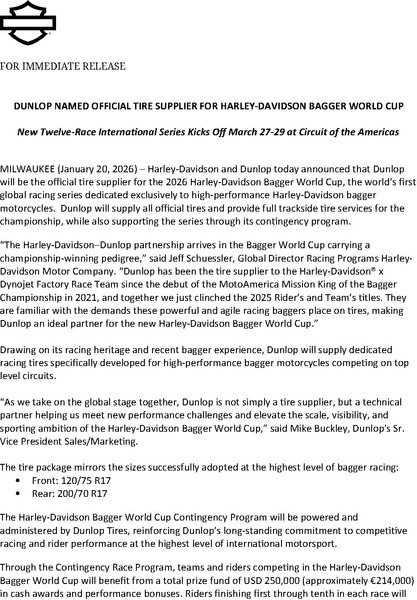 MILWAUKEE (January 20, 2026) – Harley-Davidson and Dunlop today announced that Dunlop will be the official tire supplier for the 2026 Harley-Davidson Bagger World Cup, the world’s first global racing series dedicated exclusively to high-performance Harley-Davidson bagger motorcycles. Dunlop will supply all official tires and provide full trackside tire services for the championship, while also supporting the series through its contingency program.
