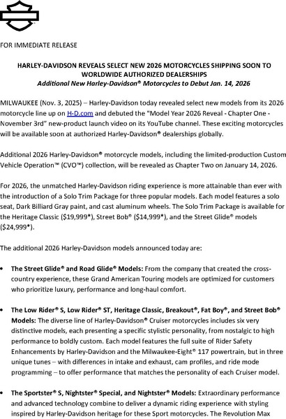 MILWAUKEE (Nov. 3, 2025) – Harley-Davidson today revealed select new models from its 2026 motorcycle line up on H-D.com and debuted the “Model Year 2026 Reveal - Chapter One - November 3rd” new-product launch video on its YouTube channel. These exciting motorcycles will be available soon at authorized Harley-Davidson® dealerships globally.