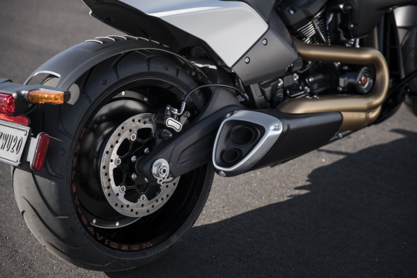 The aluminum swingarm achieves a 10.2-pound weight reduction (13.8 pounds vs. 24 pounds, or 43 percent less) over a steel Softail swingarm accommodating a 240 mm rear tire. Because the unsprung weight (weight located below the suspension) it has a significant impact on rear suspension performance, enhanced further by a lightweight 18-inch-diameter aluminum disc rear wheel. The 19-inch forged aluminum Ace front wheel is a light-weight design that features very thin spokes. The FXDR 114 seat and tail section are supported by a sub-frame of welded aluminum tubing, and the tail section is composite. This replaces a steel subframe, steel rear fender and aluminum fender supports used on other Softail models, for a weight savings of about seven pounds. Front and rear fenders are lightweight composite material.