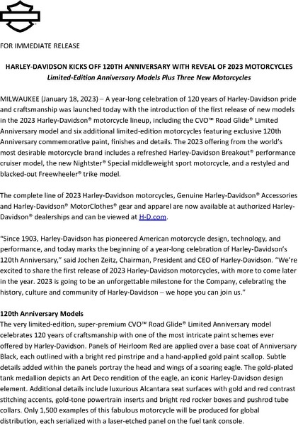 “Since 1903, Harley-Davidson has pioneered American motorcycle design, technology, and performance, and today marks the beginning of a year-long celebration of Harley-Davidson’s 120th Anniversary,” said Jochen Zeitz, Chairman, President and CEO of Harley-Davidson. “We’re excited to share the first release of 2023 Harley-Davidson motorcycles, with more to come later in the year. 2023 is going to be an unforgettable milestone for the Company, celebrating the history, culture and community of Harley-Davidson – we hope you can join us.”