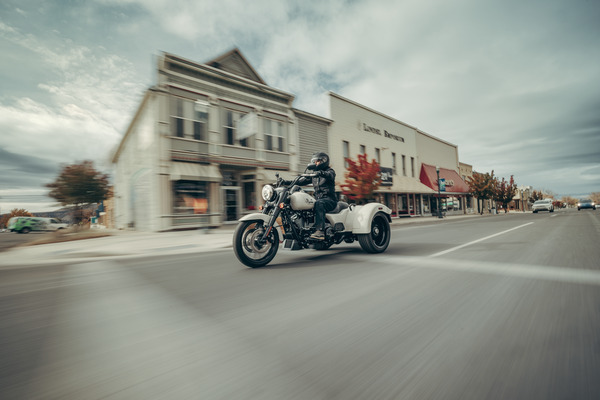 The Freewheeler® model, an attitude-soaked, cruiser-inspired trike, gets a blacked-out restyle for 2023. The front end, headlamp nacelle, tank console, hand and foot controls, powertrain and exhaust all have black finishes in place of previous bright finishes. The result is a dramatic change in appearance that reinforces this model’s raw, hot-rod attitude.
