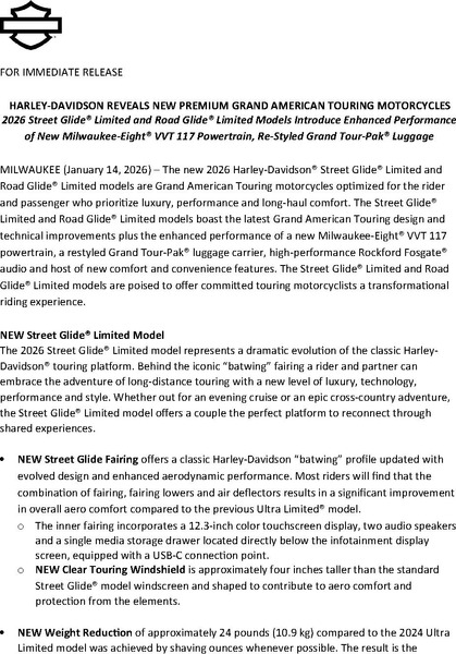 MILWAUKEE (January 14 2026) – The new 2026 Harley-Davidson® Street Glide® Limited and Road Glide® Limited models are Grand American Touring motorcycles optimized for the rider and passenger who prioritize luxury, performance and long-haul comfort. The Street Glide® Limited and Road Glide® Limited models boast the latest Grand American Touring design and technical improvements plus the enhanced performance of a new Milwaukee-Eight® VVT 117 powertrain, a restyled Grand Tour-Pak® luggage carrier, high-performance Rockford Fosgate® audio and host of new comfort and convenience features. The Street Glide® Limited and Road Glide® Limited models are poised to offer committed touring motorcyclists a transformational riding experience.