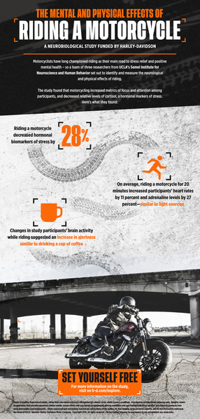 MILWAUKEE (January 17, 2019) – Motorcyclists have long championed riding as their main road to stress relief and positive mental health. Today, the results of a neurobiological study conducted by a team of three researchers from UCLA’s Semel Institute for Neuroscience and Human Behavior yielded pioneering scientific evidence revealing the potential mental and physical benefits of riding. Funded by Harley-Davidson, the study found that motorcycling increased metrics of focus and attention, and decreased relative levels of cortisol, a hormonal marker of stress.