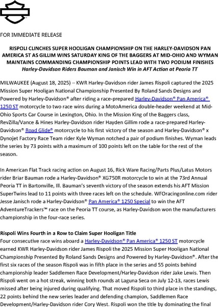 MILWAUKEE (August 18, 2025) – KWR Harley-Davidson rider James Rispoli captured the 2025 Mission Super Hooligan National Championship Presented By Roland Sands Designs and Powered by Harley-Davidson® after riding a race-prepared Harley-Davidson® Pan America® 1250 ST motorcycle to two race wins during a MotoAmerica double-header weekend at Mid-Ohio Sports Car Course in Lexington, Ohio. In the Mission King of the Baggers class, RevZilla/Vance & Hines Harley-Davidson rider Hayden Gillim rode a race-prepared Harley-Davidson® Road Glide® motorcycle to his first victory of the season and Harley-Davidson® x Dynojet Factory Race Team rider Kyle Wyman notched a pair of podium finishes. Wyman leads the series by 73 points with a maximum of 100 points left on the table for the rest of the season.